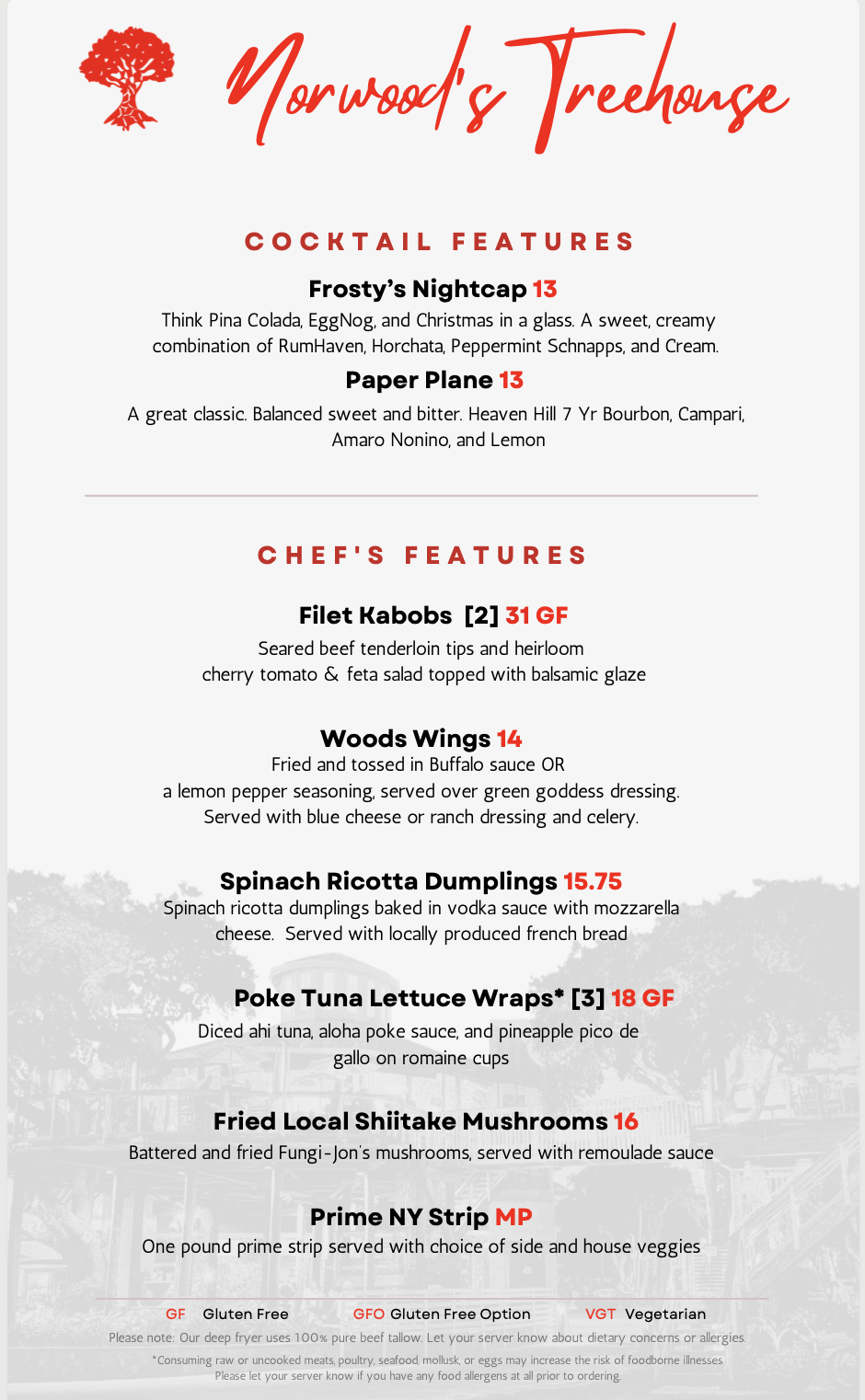Treehouse Bar Open Until 11:00pm Friday & Saturday 21 & Up Happy Hour Monday-Friday 4:00pm-6:00pm