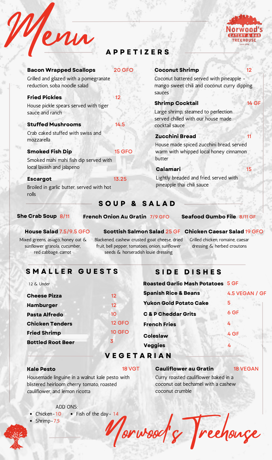 Late Night Happy Hour Sun - Thur 8:00pm-10:00pm (treehouse only) Daily Sunset Menu Monday- Friday 4:00pm-6:00pm Saturday & Sunday 3:00pm-5:00pm Dinner Served all Day!